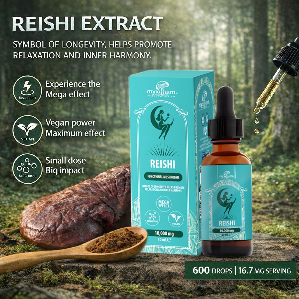 Concentrated Reishi extract for relaxation and inner harmony. A symbol of longevity. 10,000 mg in 30 ml, 100% vegan with a precise microdosing system. Reishi mushroom extract, extracted from Ganoderma lucidum. This functional mushroom is a symbol of longevity and promotes relaxation and inner harmony. This 30 ml liquid extract contains a total of 10,000 mg of extract. Each bottle contains approximately 600 drops, with each serving providing approximately 16.7 mg, allowing for precise and efficient dosing.